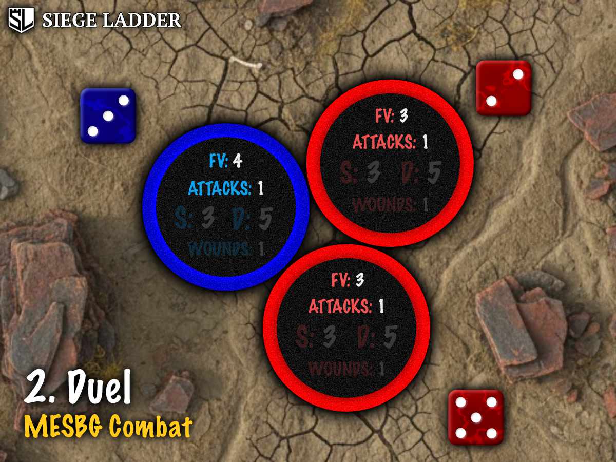 - Duel: There are 2 x Attacks for Red, 1 x Attack for Blue. Red rolls the single highest number, a 5 and so wins the Duel. Blue must back away 1".