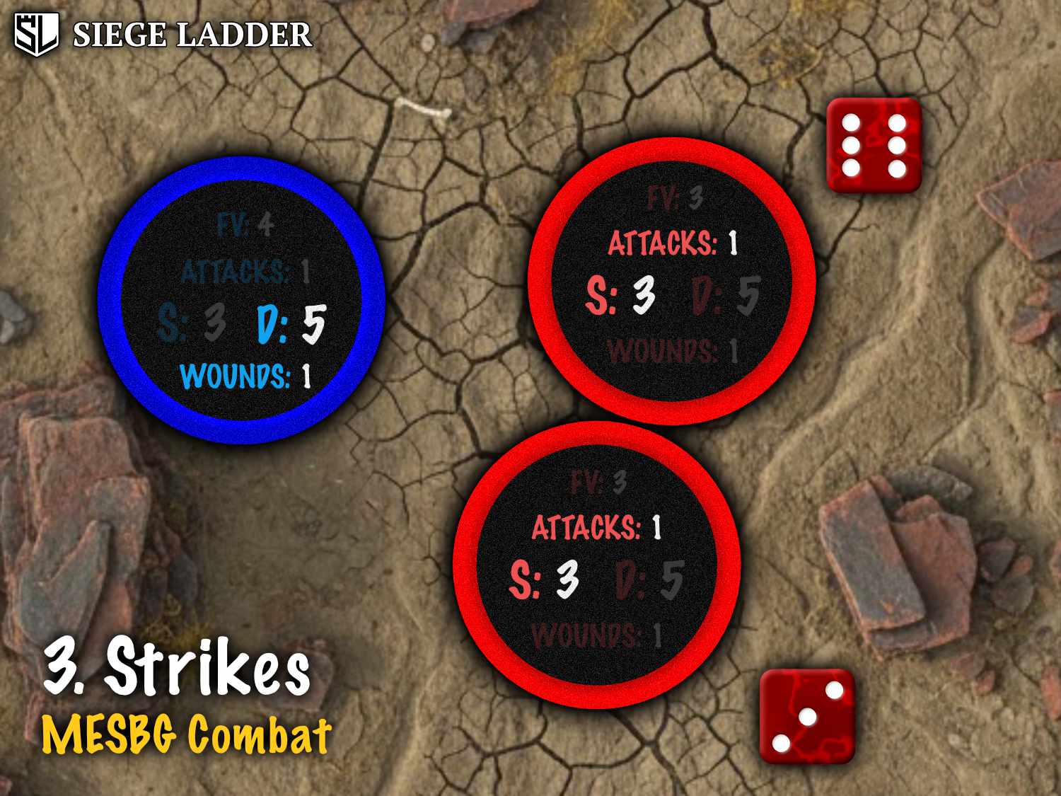 - Strikes: Red's Strength is 3, Blue's Defence is 5, so consulting the Wound Chart, we can see that Red needs 5+ on their dice in order to cause a Wound. Red rolls 2 x dice, one for each model in the Fight. Rolling a 6 means Blue is wounded. With only 1 x Wound in the profile, it is removed from the board.