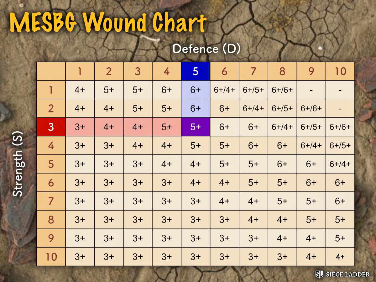 - Strikes: The winner of the Duel then has an attempt at striking their enemy, rolling the number of dice equal to the number of attacks. The number needed is then found by consulting the Wound Chart (shown below), by the attacker's Strength (S) and the defender's Defence (D).