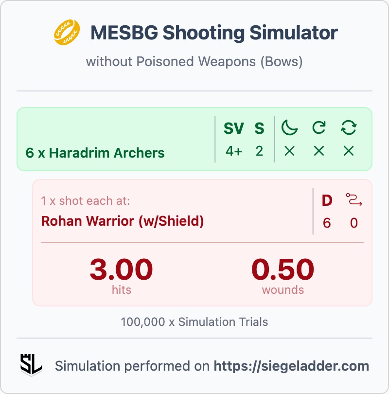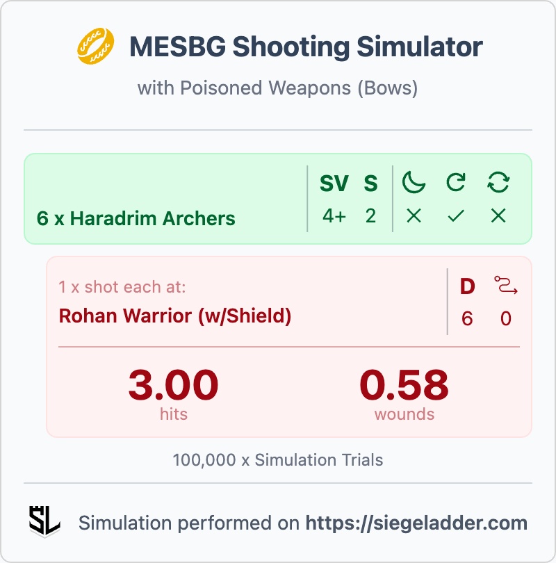 There are a few special rules in MESBG that can impact shooting, one of which is Poisoned Weapons, found on Haradrim Warriors and a few others. This ability allows you to re-roll 1's on your To Wound roll, but what impact does that have on your odds? Let's assume we have a lineup of 6 x Haradrim Archers, shooting at a line of Rohan Warriors with Shields.