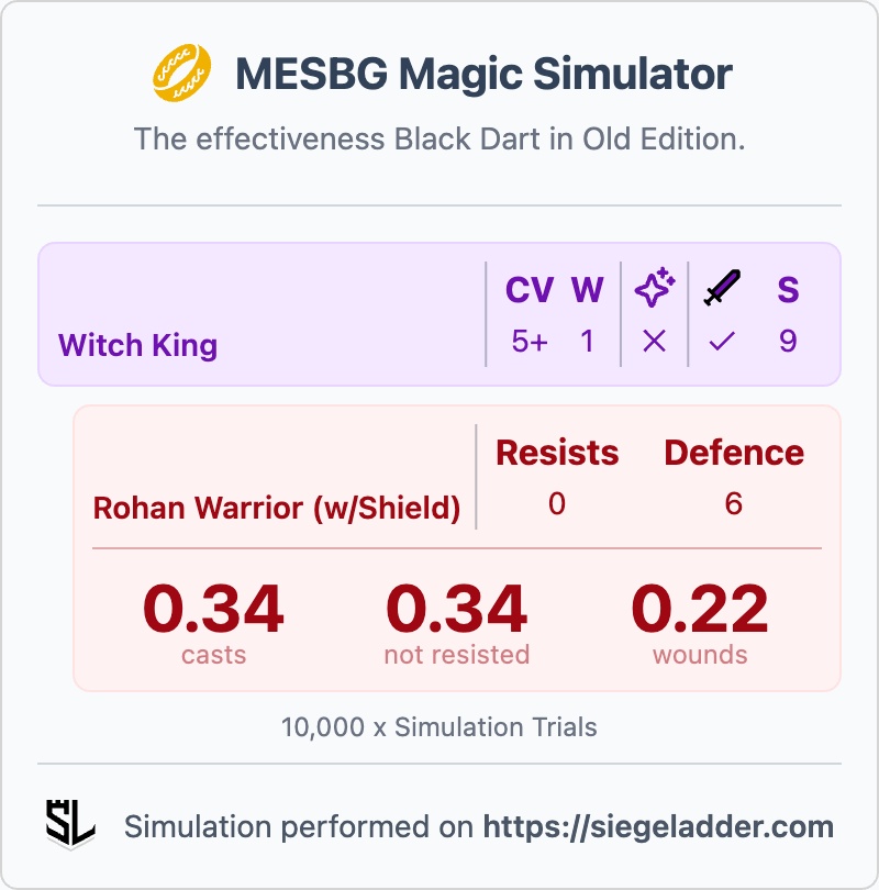 Here we can see that Back Dart, against a standard Rohan infantry model (with shield equipped) has gone needing 4.5 rounds to wound, up to 6.25 rounds. That makes Black Dart equivalent to 2 x Easterling Archers (SV 4+; Strength 2 Bows), and in my opinion, just not worth burning the Will on.